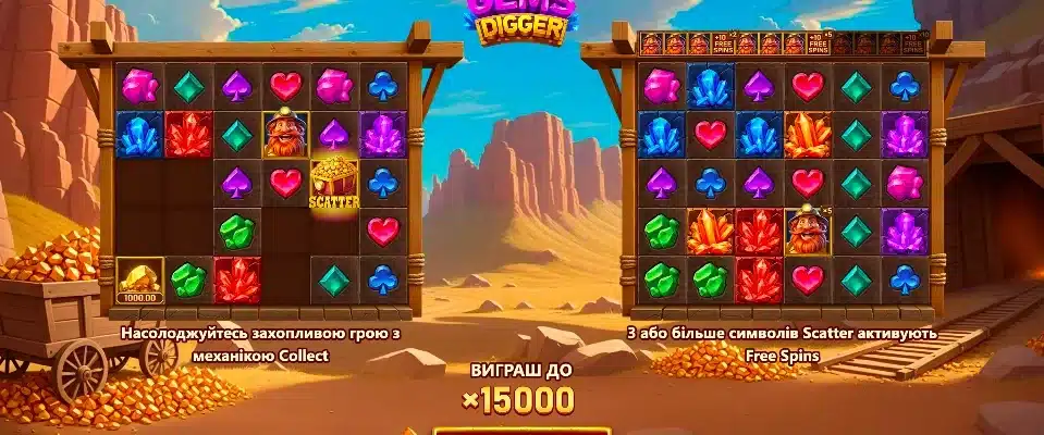 Ігровий автомат Gems Digger від провайдера Barbara Bang з гірничою тематикою. Гра використовує сітку 6×5 з системою виплат “Pay Anywhere”, де для формування виграшу потрібно зібрати від 7-8 до 11 і більше однакових символів у будь-якому місці на екрані, незалежно від їхнього розташування. Слот характеризується високою волатильністю, RTP 96% та максимальним виграшем до 15,000x ставки. Gems Digger пропонує механіки Drops та Chest Collect для каскадних виплат, символи CASH з множниками від ×1 до ×1000, золотошукача-колектора та режим Promo Spins з прогресивними множниками до ×10.